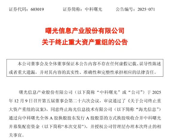 中科曙光今日發布公告,公司于2025年12月9日召開第五屆董事會第二十六次會議,審議通過了《關于公司終止重大資產重組的議案》,同意終止海光信息技術有限公司通過向中科曙光全體A股換股股東發行A股股票的方式換股吸收合并中科曙光并募集配套資金。